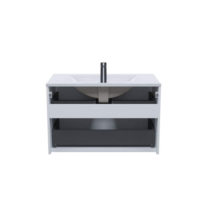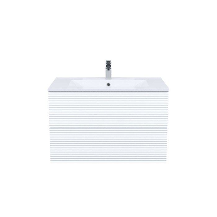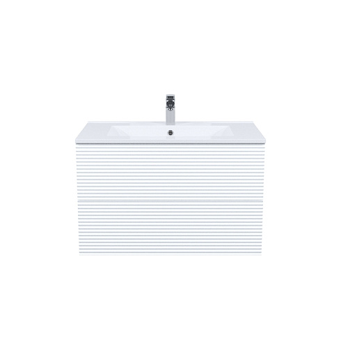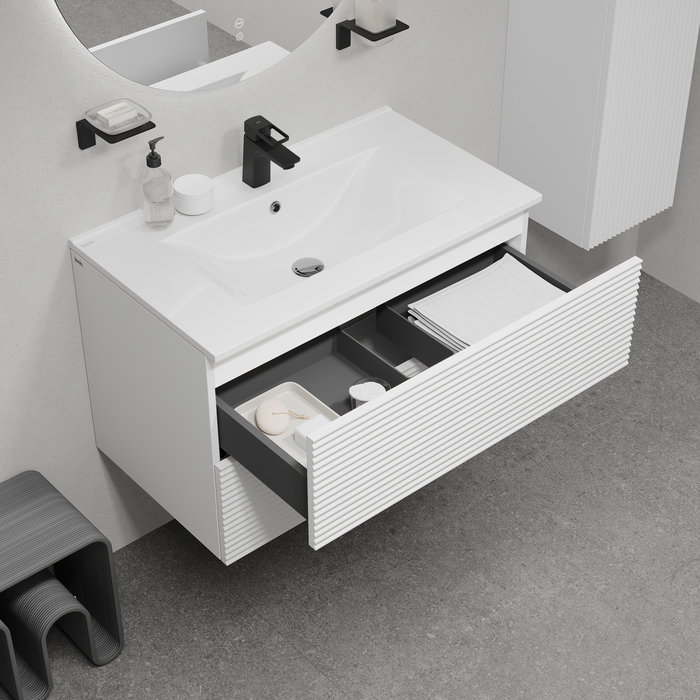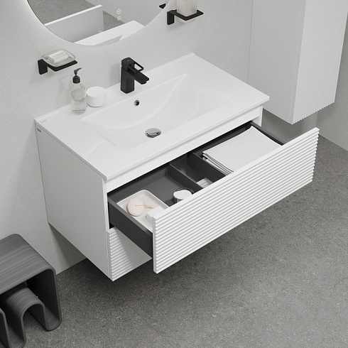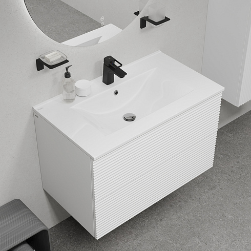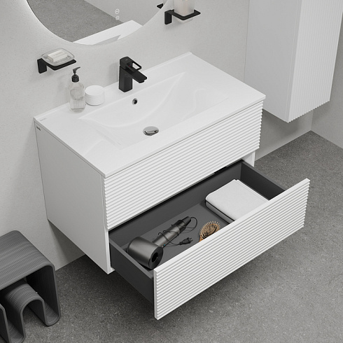 Вместительная подвесная тумба для ванной комнаты Bild с умывальником и выдвижными ящиками – красивый дизайн с трендовой горизонтальной фрезеровкой в сочетании с универсальным белым цветом, удобством и практичностью.