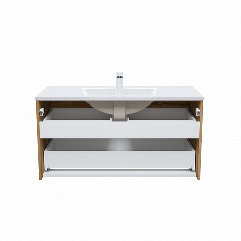 Стильная подвесная тумба Cloud из влагостойкой ЛДСП, где гармонично сочетаются боковины цвета золотистого дуба, матовые белые фасады с интегрированными ручками и тонкий умывальник. Обновление популярной коллекции мебели Cloud и украшение современной ванной в стиле лофт.