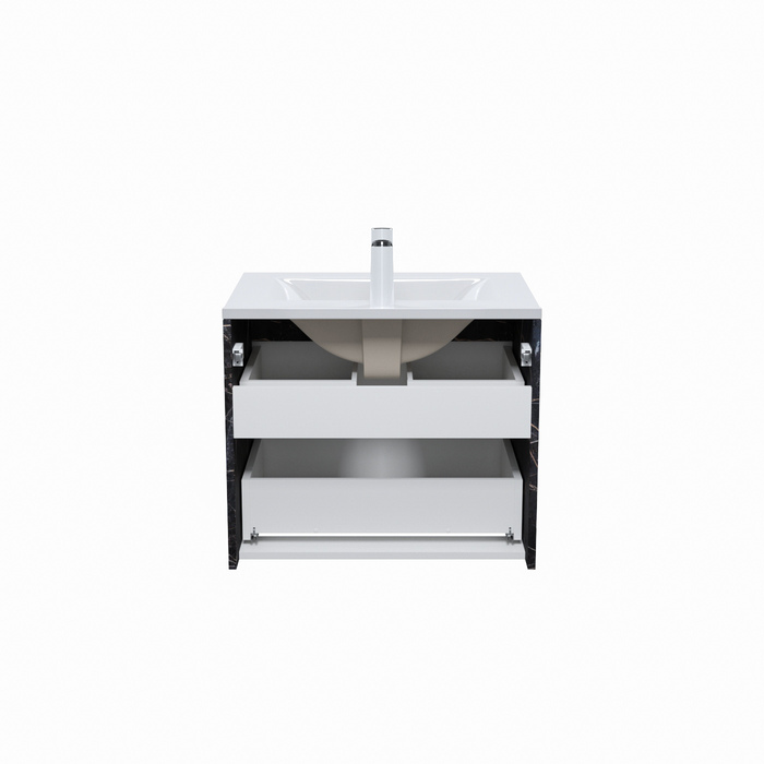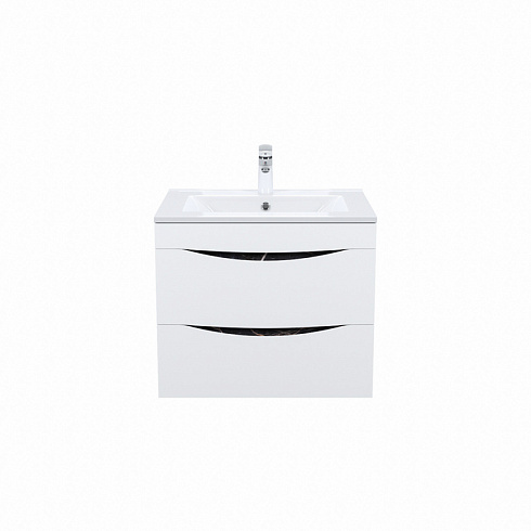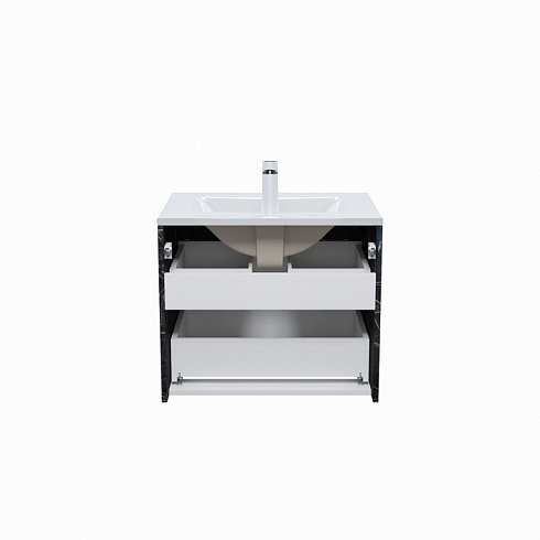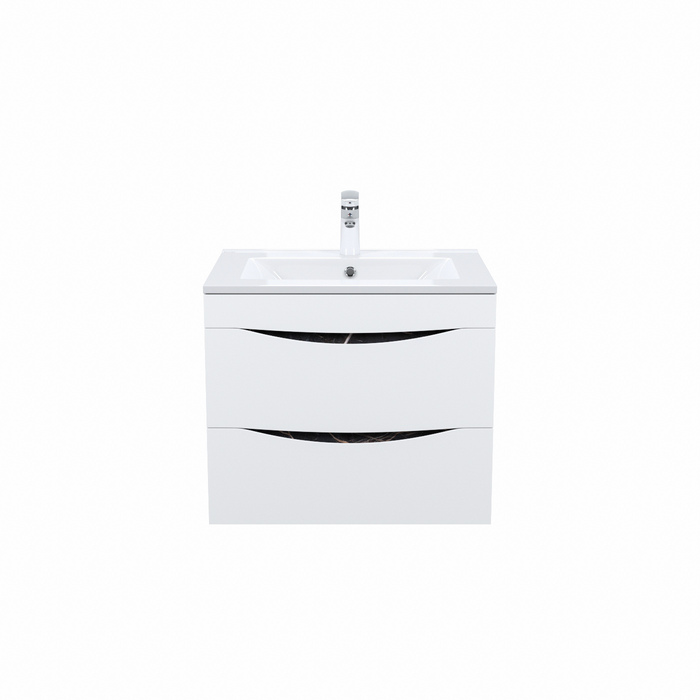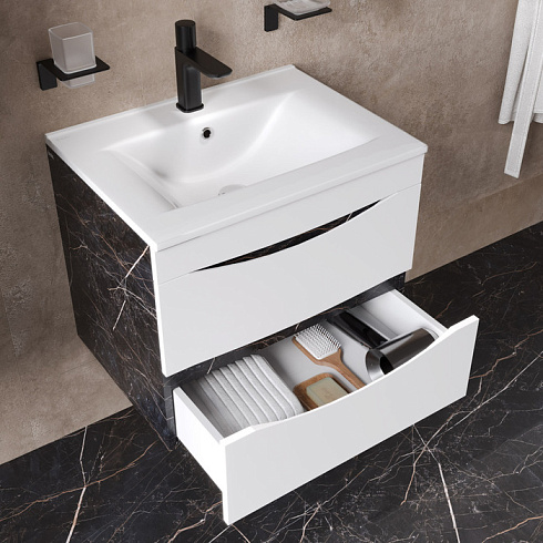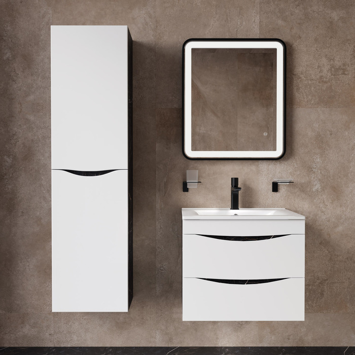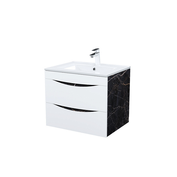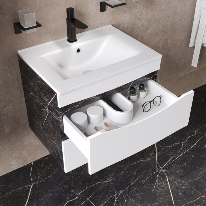 Стильная подвесная тумба Cloud из влагостойкой ЛДСП, где гармонично сочетаются боковины под черный мрамор, матовые белые фасады с интегрированными ручками и тонкий умывальник. Обновление популярной коллекции мебели Cloud и украшение современной ванной.