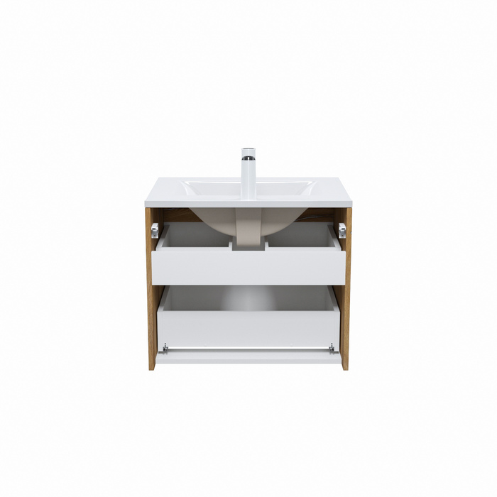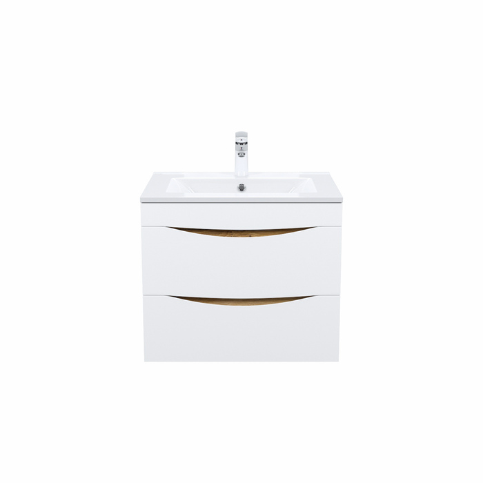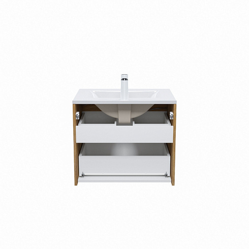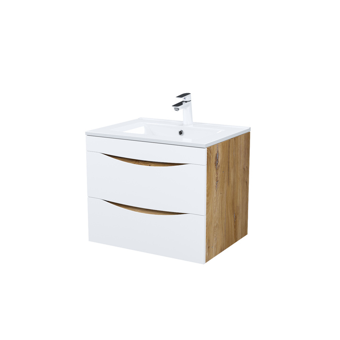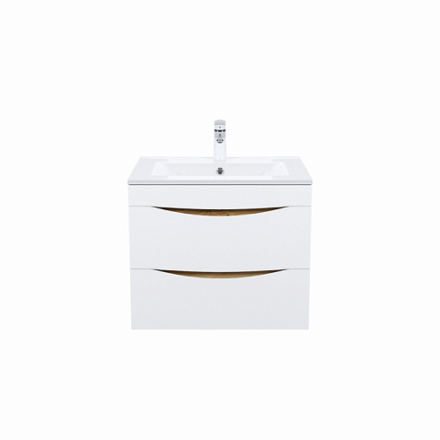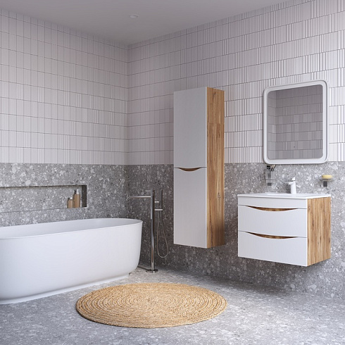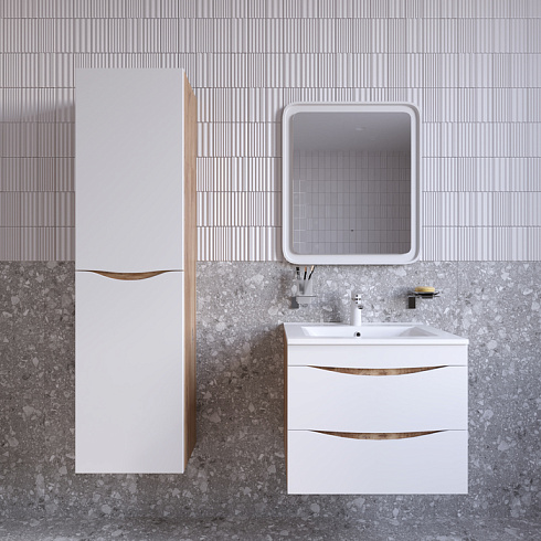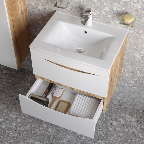Стильная подвесная тумба Cloud из влагостойкой ЛДСП, где гармонично сочетаются боковины цвета золотистого дуба, матовые белые фасады с интегрированными ручками и тонкий умывальник. Обновление популярной коллекции мебели Cloud и украшение современной ванной в стиле лофт.