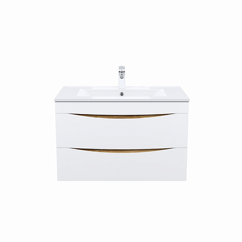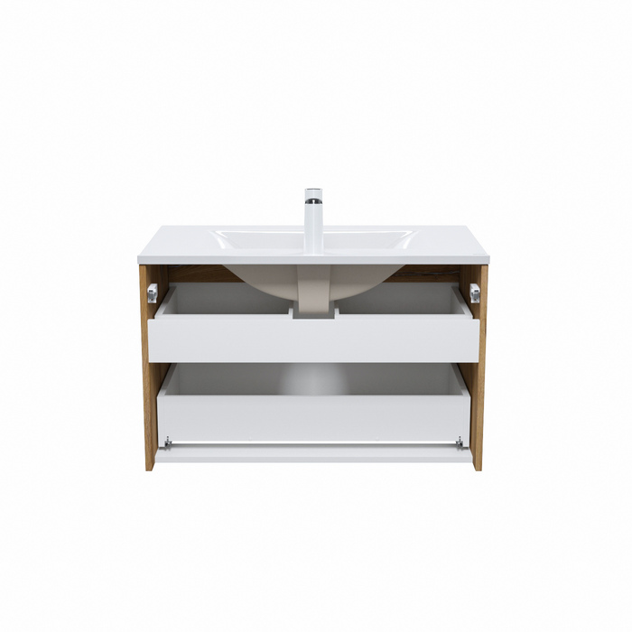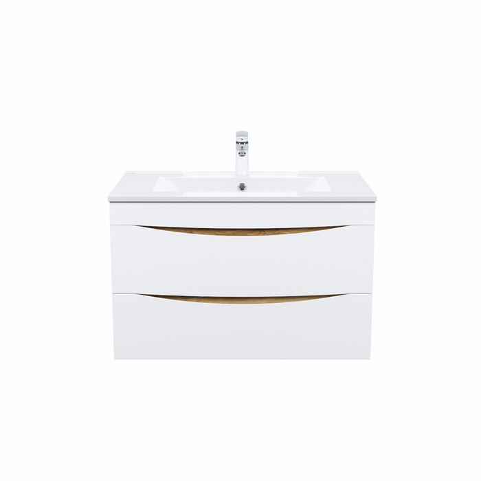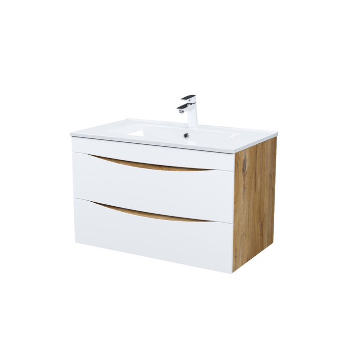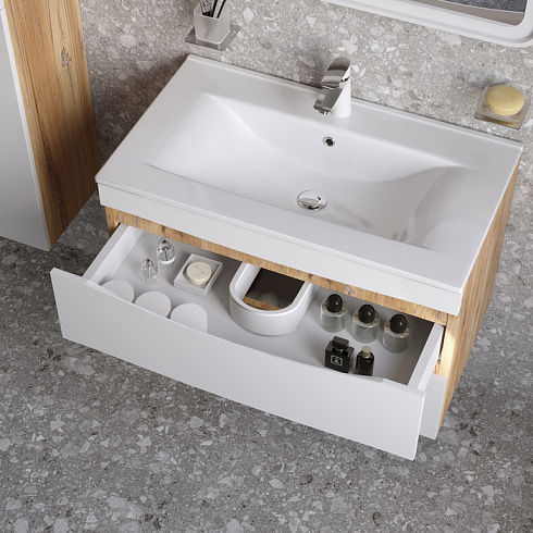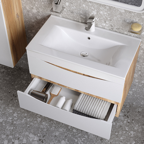 Стильная подвесная тумба Cloud из влагостойкой ЛДСП, где гармонично сочетаются боковины цвета золотистого дуба, матовые белые фасады с интегрированными ручками и тонкий умывальник. Обновление популярной коллекции мебели Cloud и украшение современной ванной в стиле лофт.