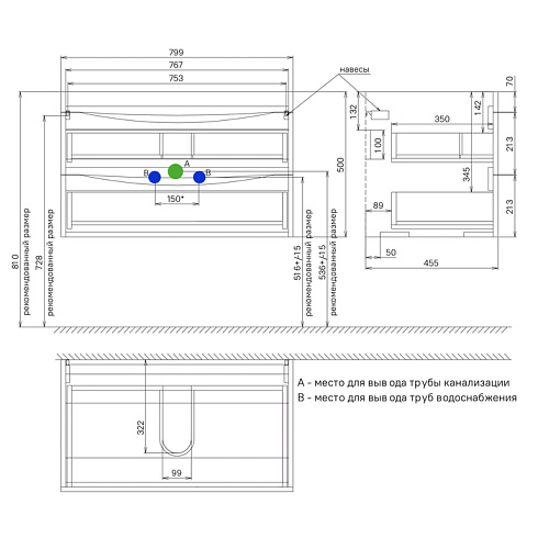 • Подвесная конструкция тумбы делает ее воздушной и упрощает процесс уборки в ванной.