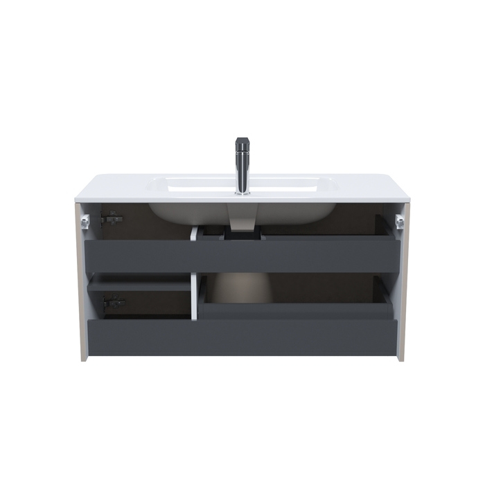 Вместительная подвесная тумба с плоским умывальником Edifice в теплом оттенке капучино – воплощение современного минимализма. Мягкие линии корпуса в сочетании с удобными интегрированными ручками выглядят свежо и актуально. Смотрится аккуратно, легко и не усложняет процесс уборки в ванной благодаря подвесной конструкции.