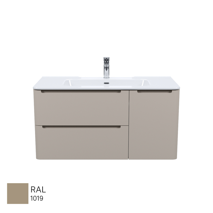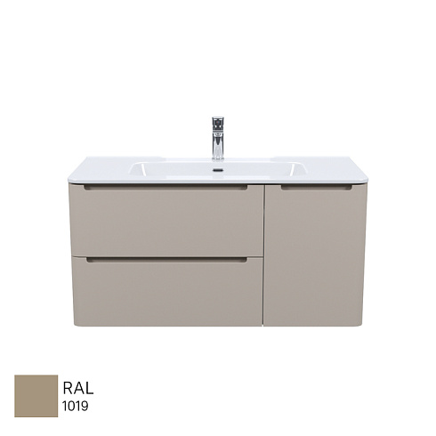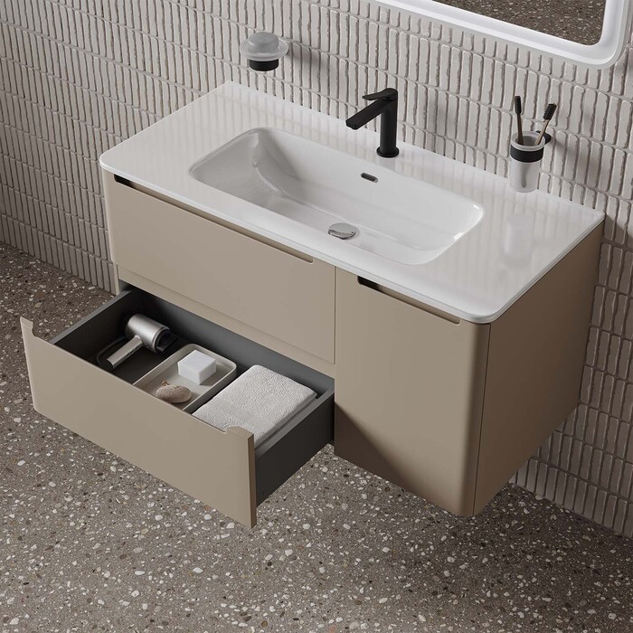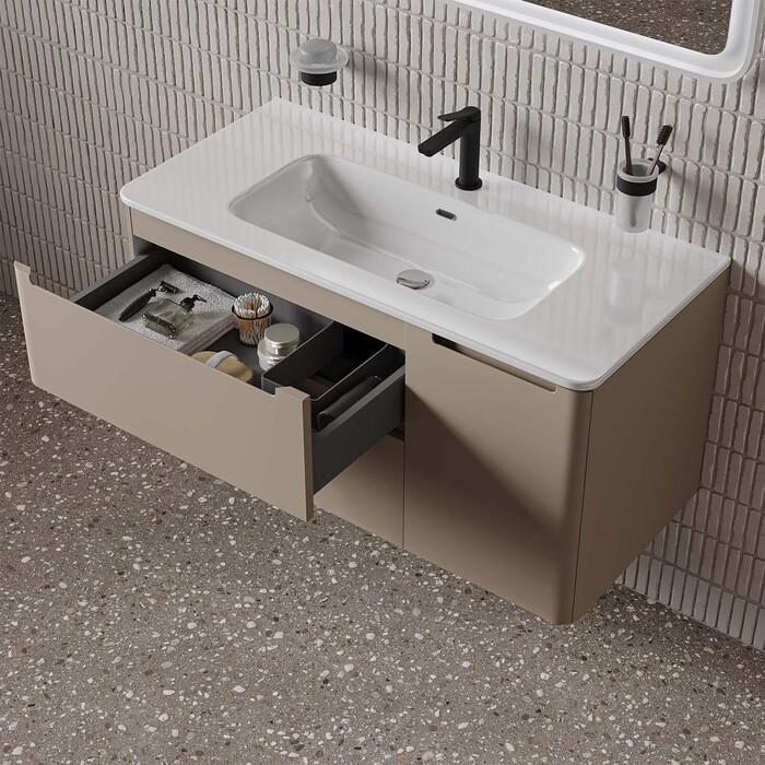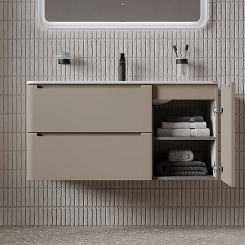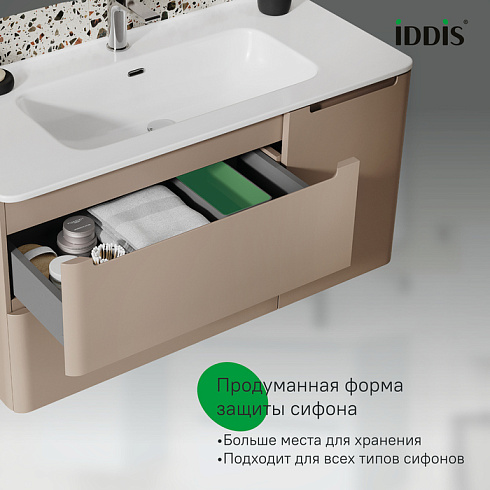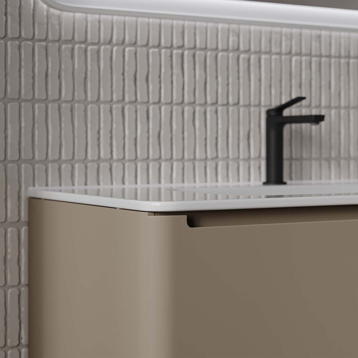 Вместительная подвесная тумба с плоским умывальником Edifice в теплом оттенке капучино – воплощение современного минимализма. Мягкие линии корпуса в сочетании с удобными интегрированными ручками выглядят свежо и актуально. Смотрится аккуратно, легко и не усложняет процесс уборки в ванной благодаря подвесной конструкции.