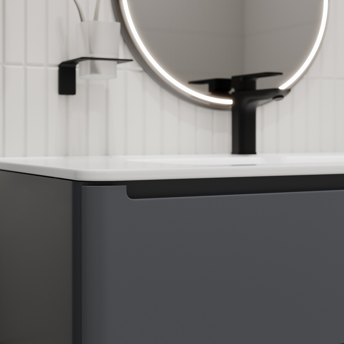 Вместительная подвесная тумба с плоским умывальником Edifice стильного темно-серого цвета – воплощение современного минимализма. Мягкие линии корпуса в сочетании с удобными интегрированными ручками выглядят свежо и актуально. Смотрится аккуратно, легко и не усложняет процесс уборки в ванной благодаря подвесной конструкции.