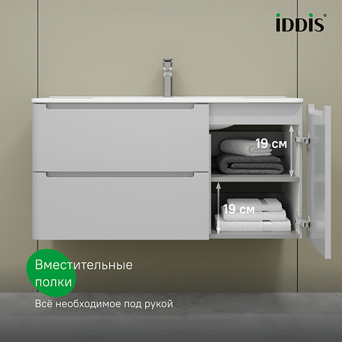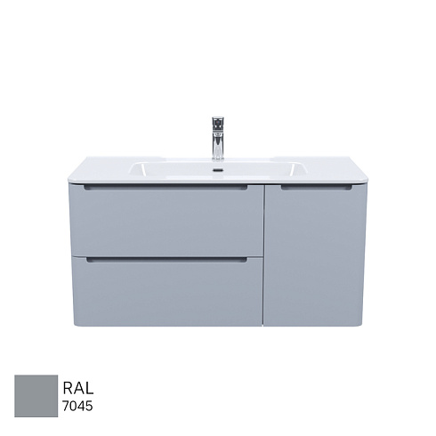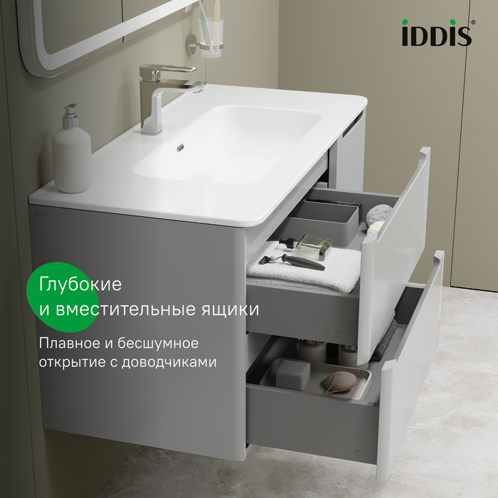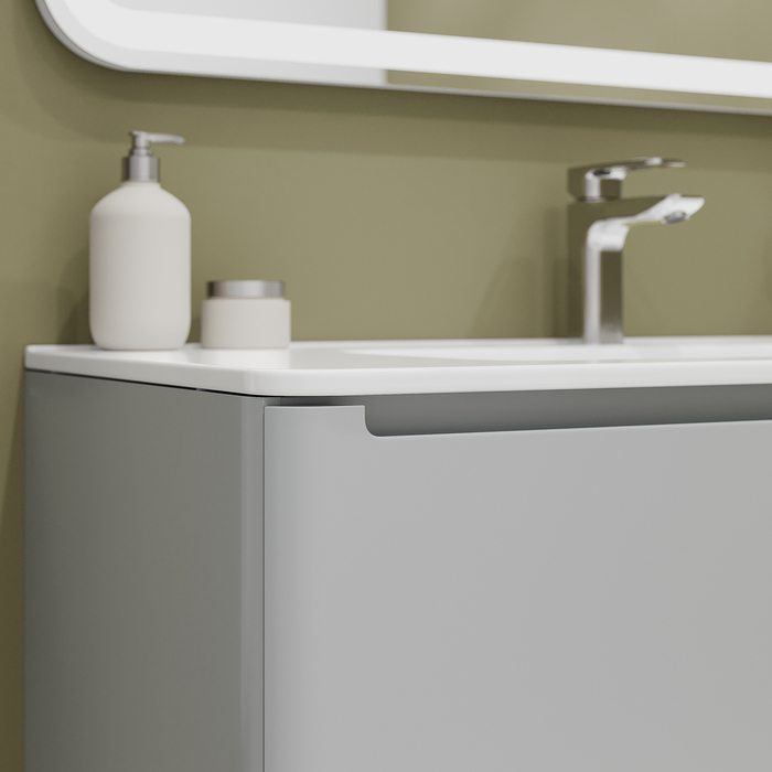Вместительная подвесная тумба с плоским умывальником Edifice в стильном светло-сером цвете – воплощение современного минимализма. Мягкие линии корпуса в сочетании с удобными интегрированными ручками выглядят свежо и актуально. Смотрится аккуратно, легко и не усложняет процесс уборки в ванной благодаря подвесной конструкции.