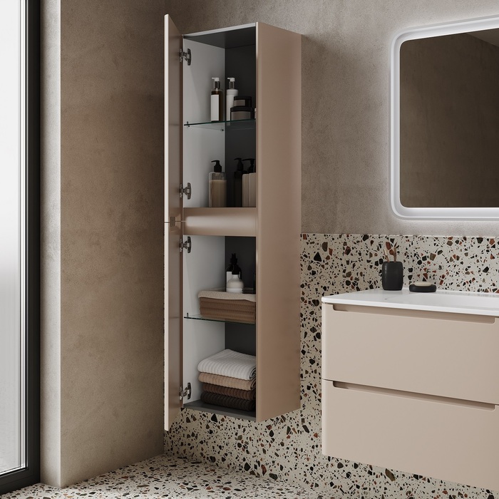 Подвесной пенал Edifice в теплом оттенке капучино – воплощение современного минимализма. Мягкие линии корпуса в сочетании с удобными интегрированными ручками выглядят свежо и актуально. Смотрится компактным, легким и не усложняет процесс уборки в ванной благодаря подвесной конструкции.
