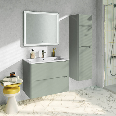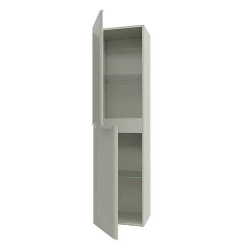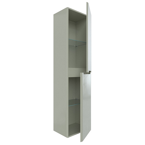 Фасады МДФ 19 мм в эмали (цвет фисташково-серый), фрезеровка. Корпус ЛМДФ 16 мм в эмали. Две дверцы с интегрированными ручками. Стеклянные полки 4 мм с фиксаторами. Петли с доводчиками. Упаковка: картон, пленка, пенопластовые уголки.
