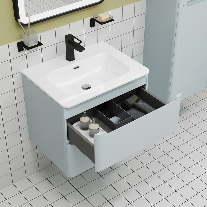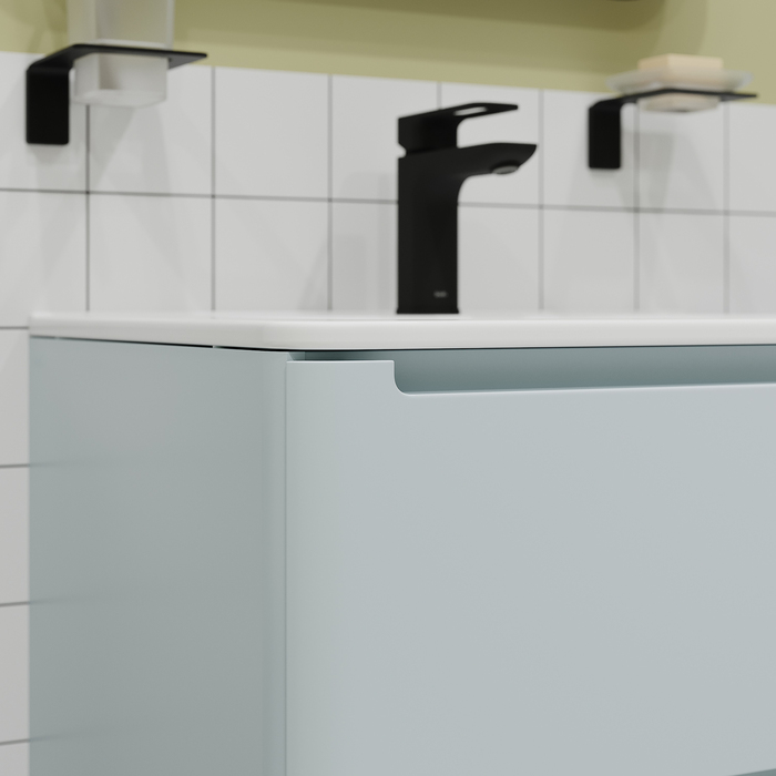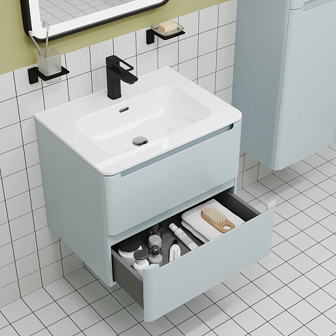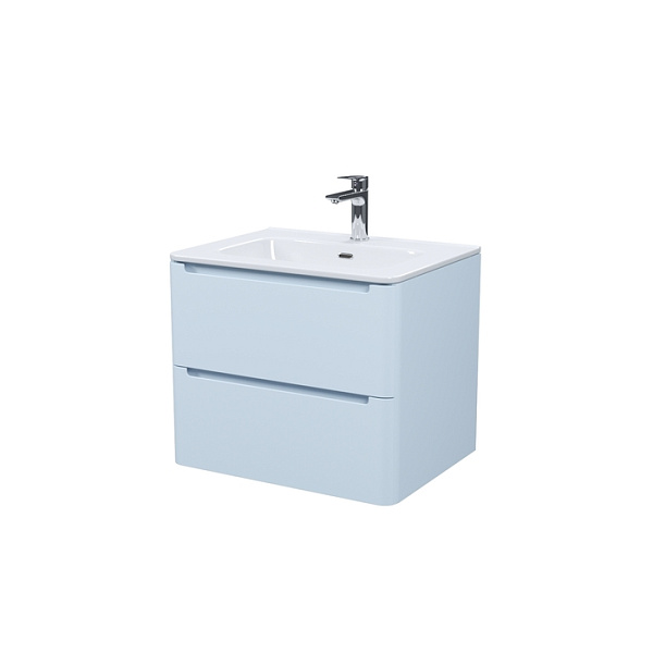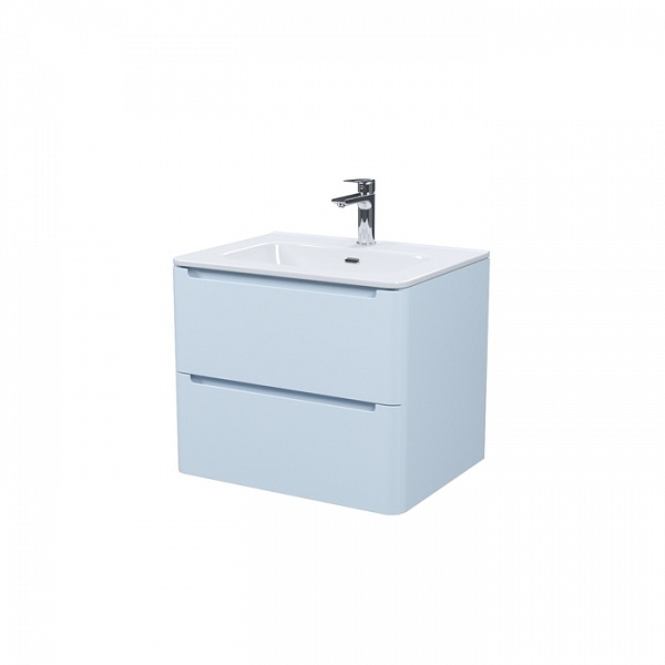 Компактная подвесная тумба с плоским умывальником Edifice в нежно-голубом оттенке – воплощение современного минимализма. Мягкие линии корпуса в сочетании с удобными интегрированными ручками выглядят свежо и актуально. Смотрится аккуратно, легко и не усложняет процесс уборки в ванной благодаря подвесной конструкции.