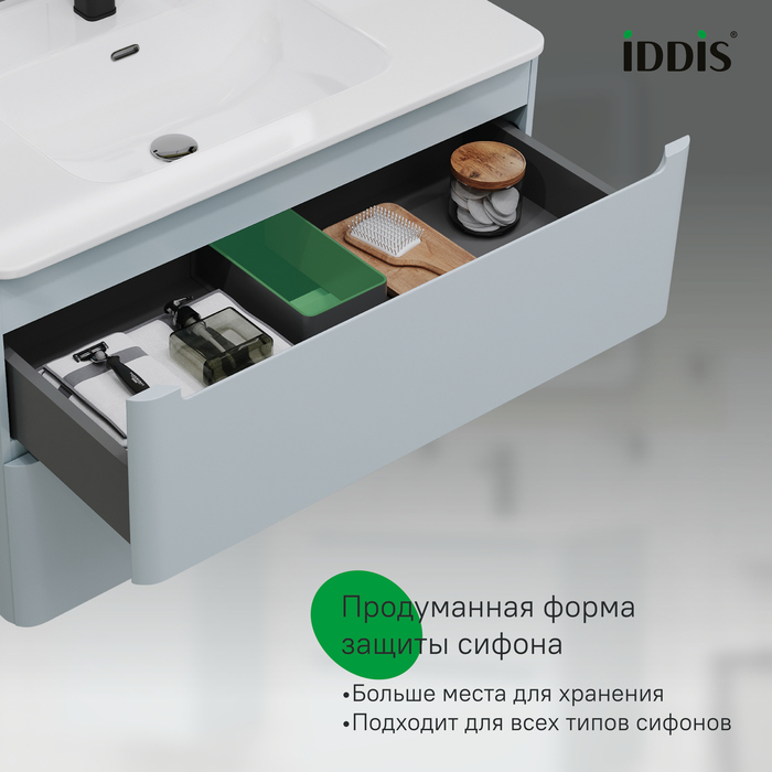 Подвесная тумба с плоским умывальником Edifice в нежно-голубом оттенке – воплощение современного минимализма. Мягкие линии корпуса в сочетании с удобными интегрированными ручками выглядят свежо и актуально. Смотрится аккуратно, легко и не усложняет процесс уборки в ванной благодаря подвесной конструкции.