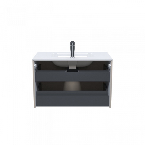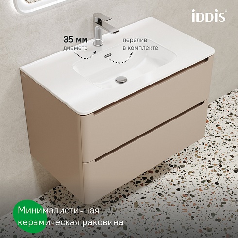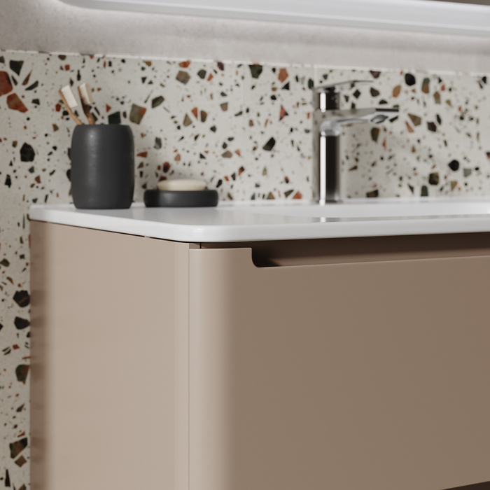 Подвесная тумба с плоским умывальником Edifice в теплом оттенке капучино – воплощение современного минимализма. Мягкие линии корпуса в сочетании с удобными интегрированными ручками выглядят свежо и актуально. Смотрится аккуратно, легко и не усложняет процесс уборки в ванной благодаря подвесной конструкции.