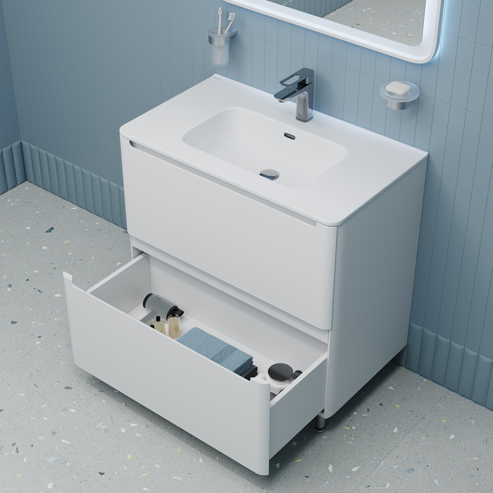 Напольная тумба Edifice с плоским умывальником – новое решение для организации пространства ванной, сохранившее узнаваемый облик любимой коллекции. Мебель Edifice – воплощение современного минимализма: мягкие линии корпуса в сочетании с удобными интегрированными ручками выглядят свежо и актуально. Хромированные ножки гармонично дополняют белый полуматовый фасад и поддерживают дизайн смесителей IDDIS® из одноименной коллекции. Напольная тумба Edifice – удобное продуманное решение для тех, кому нужна увеличенная вместительность для хранения тяжелых предметов: больших пакетов со стиральным порошком и емкостей с бытовой химией.