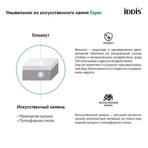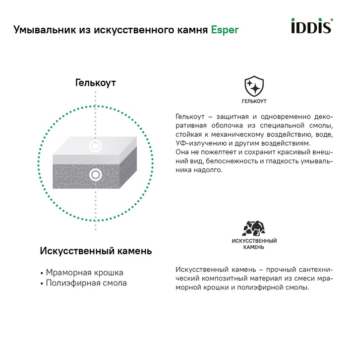 • Покрытие умывальника IDDIS® из гелькоута обладает стойкостью к загрязнению благодаря отсутствию микропор. Гелькоут отличается глянц