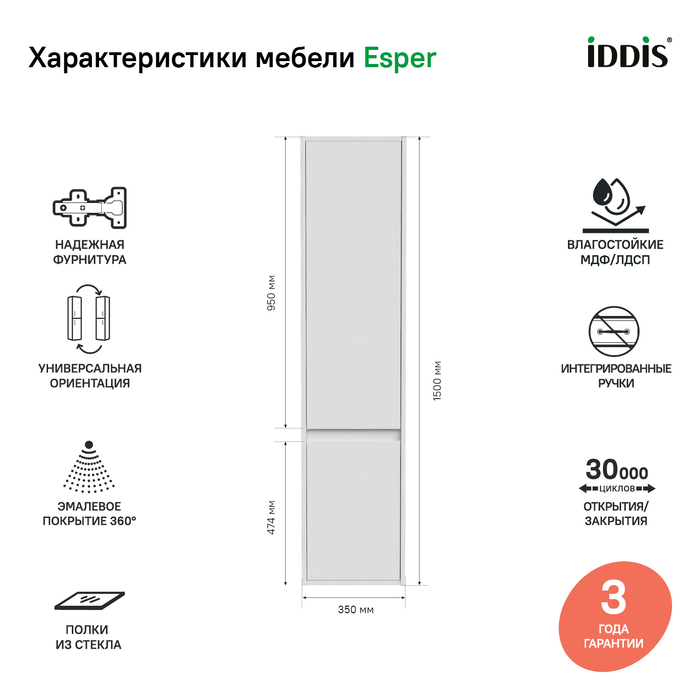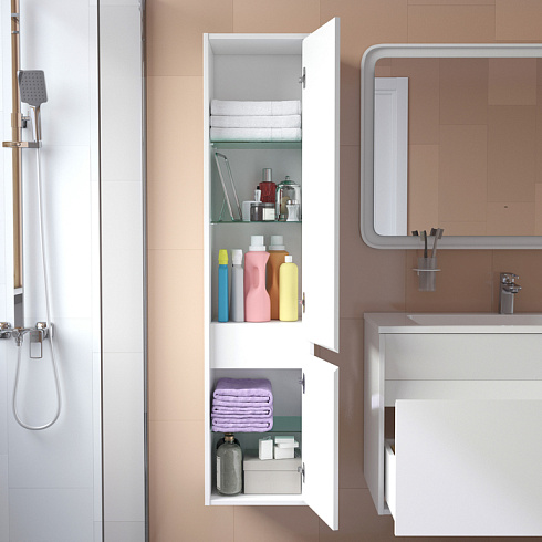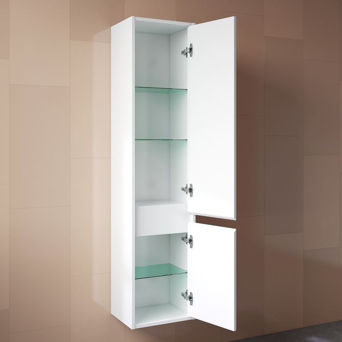 Мебельная коллекция Esper – выбор тех, кто ценит одновременно простые и продуманные решения. Глянцевый фасад придает подвесному пеналу Esper современный внешний вид. Интегрированная ручка обеспечивает дополнительный комфорт и безопасность. Пенал можно повесить вплотную к стене или разместить в узкой нише благодаря утопленным в фасад дверкам. Он имеет универсальную ориентацию: можно самостоятельно выбрать, где расположить большое отделение и в какую сторону будут открываться дверцы.