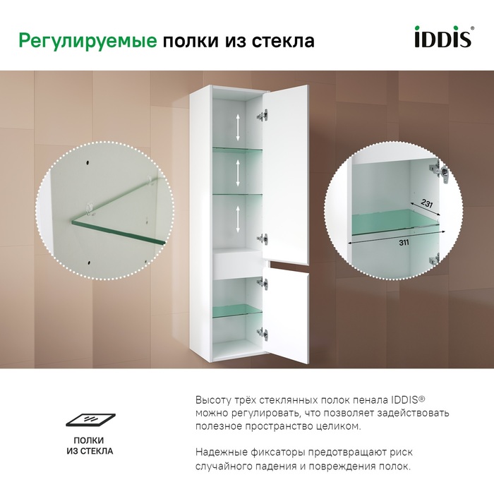 • Высоту трёх стеклянных полок пенала IDDIS® можно регулировать, что позволяет задействовать полезное пространство целиком. Надежные фиксаторы предотвращают риск их случайного падения и повреждения.