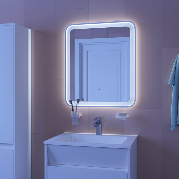 • Для управления подсветкой достаточно простого взмаха руки перед овальным сенсором в нижней части зеркала. Взмах руки включает фронтальную подсветку и активирует внешнюю. На зеркальной поверхности не остается отпечатков пальцев благодаря отсутствию контакта с руками.