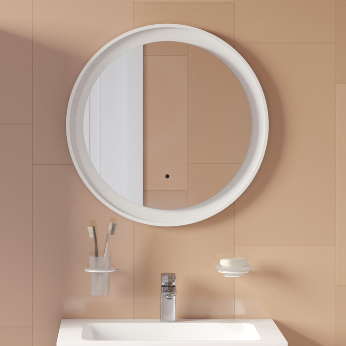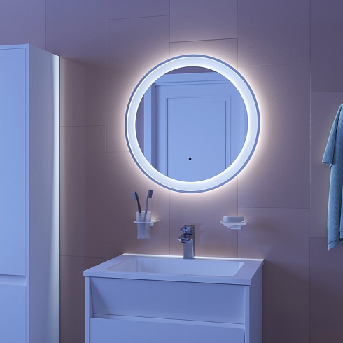 • Для управления подсветкой достаточно простого взмаха руки перед круглым сенсором в нижней части зеркала. Взмах руки включает фронтальную подсветку и активирует внешнюю. На зеркальной поверхности не остается отпечатков пальцев благодаря отсутствию контакта с руками.