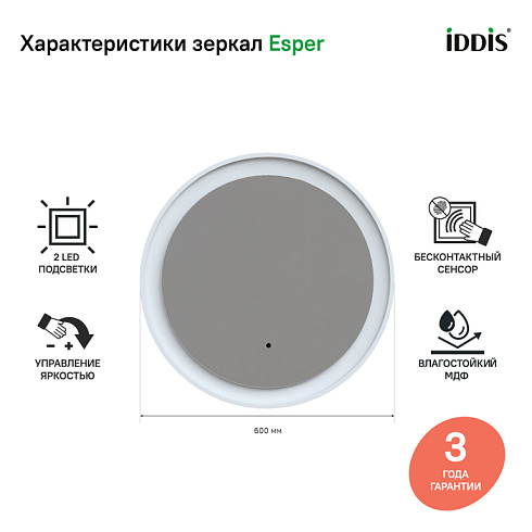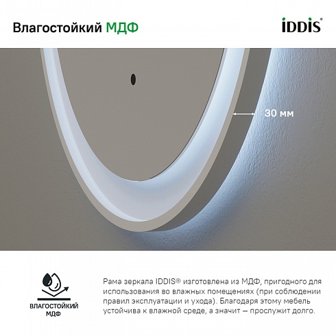 • Рама зеркала IDDIS® изготовлена из влагостойкого МДФ и покрыта пленкой. Благодаря этому зеркало устойчиво к влажной среде, а значит — прослужит долго и сохранит свой первоначальный вид.