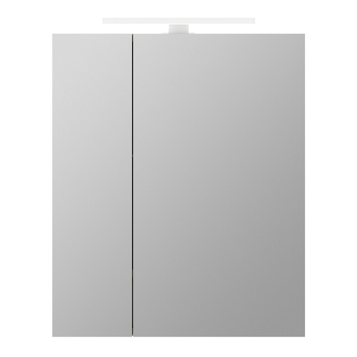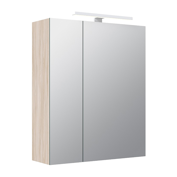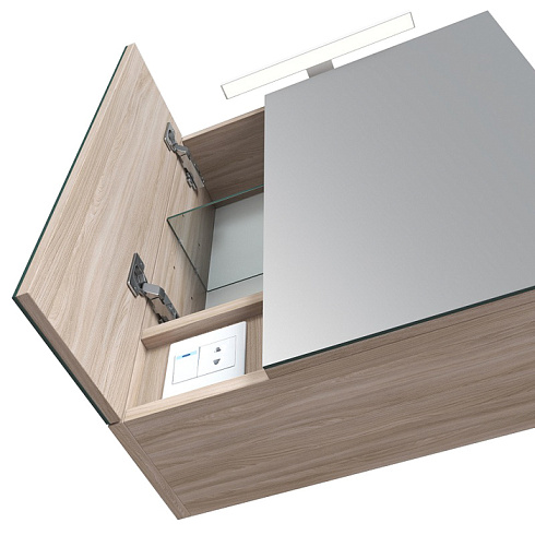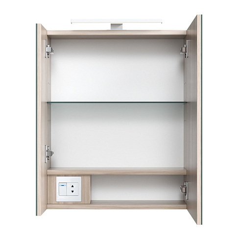Шкаф-зеркало для ванной комнаты. Материал: ЛДСП 16 мм, цвет "ясень шимо". Размеры: 166х500х600 мм (ДхШхВ). Две распашные зеркальные дверцы. Стеклянная полка крепится на фиксаторы. Выносной LED-светильник, кнопка включения расположена на фронтальной части, рядом со встроенной розеткой. Петли с доводчиками. Упаковка: картон, пленка, пенопластовые уголки.