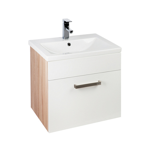 Тумба с умывальником для ванной комнаты, подвесная. Размеры тумбы без умывальника: 395х495х555 мм (ДхШхВ). Размеры умывальника: 400х500 мм (ДхШ). Фасад ЛДСП 16 мм в эмали, боковины ЛДСП под дерево (ясень шимо). выдвижной ящик с механизмом плавного доведения, внутренний ящик без доводчика. Упаковка: картонная коробка.