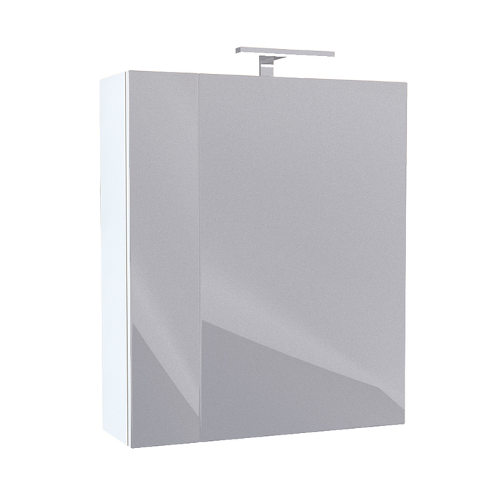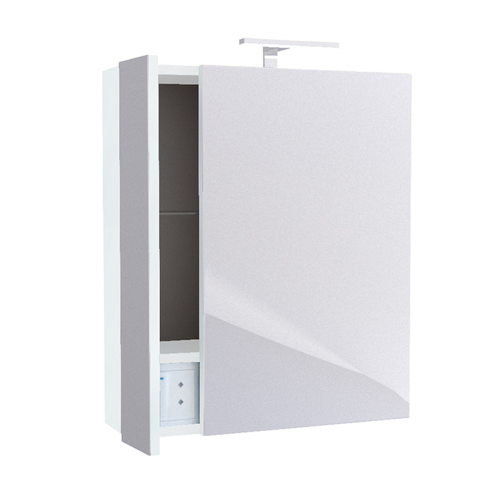 Размеры: 166х500х600 мм (ДхШхВ). Материал: ЛДСП 16 мм, цвет белый. Две распашные зеркальные дверцы. Стеклянная полка крепится на фиксаторы. Встроенный LED-светильник, кнопка включения расположена на фронтальной части, рядом со встроенной розеткой. Петли с доводчиками. Упаковка: картон, пленка, пенопластовые уголки.