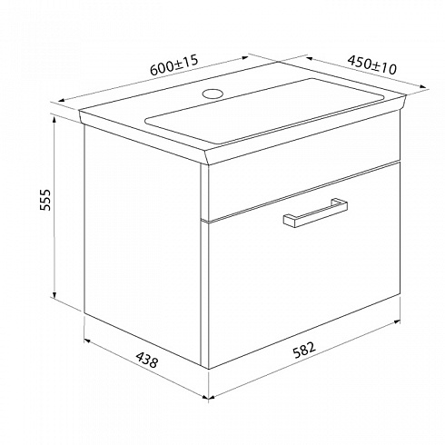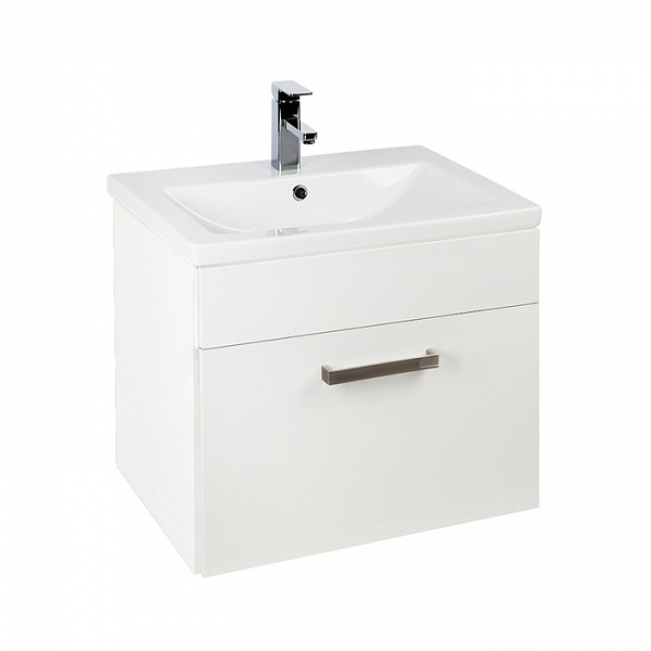 Тумба с умывальником для ванной комнаты, подвесная. Размеры тумбы: 438х582х555 мм (ДхШхВ). Размеры умывальника: 450х600 мм (ДхШ). Фасад ЛДСП 16 мм, эмаль, цвет белый глянец. Боковины ЛДСП 16 мм, эмаль, цвет белый. Выдвижной ящик с механизмом плавного доведения, внутренний ящик для мелочей без доводчика. Упаковка: картон, пленка, пенопластовые уголки.