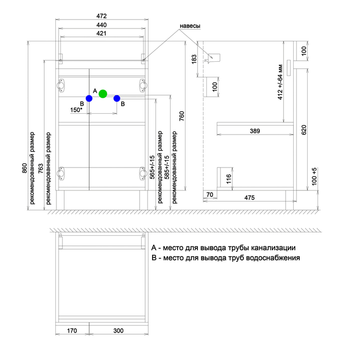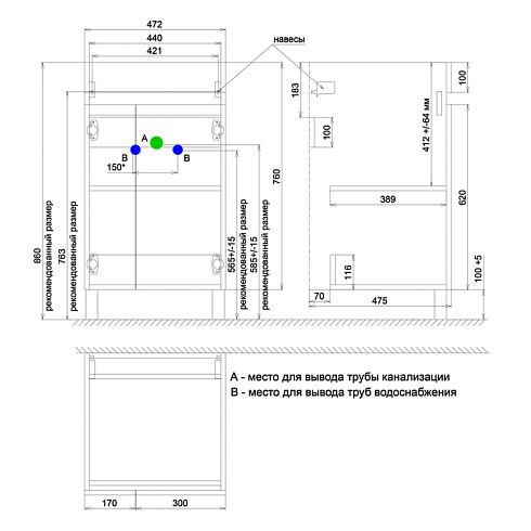 • Простой монтаж: ножки и настенный крепеж тумбы регулируются по высоте.