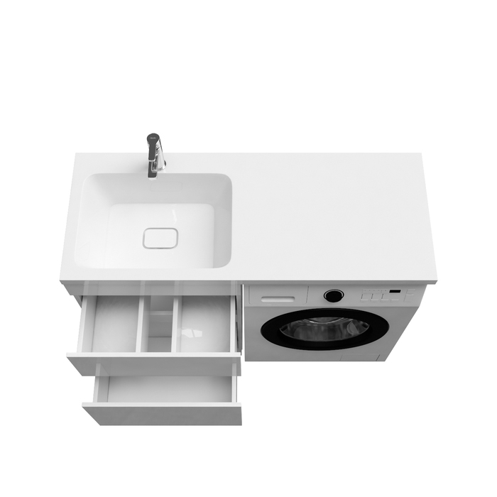 Тумба Optima Home – это удобное решение, чтобы организовать одновременно и зону умывания, и расположить стиральную машину. Модель подходит для установки стиральных машин с фронтальной загрузкой, справа от тумбы. В коллекции Optima Home также представлен вариант c расположением машинки слева от тумбы (арт. OPH12RBi95K). Два вместительных ящика обеспечивают удобное хранение ванных принадлежностей и аксессуаров, бытовой химии и принадлежностей для стирки. Высокие ножки позволяют скрыть коммуникации под тумбой и защитить ее от повреждения при затоплении. Тумбу дополняет умывальник (арт. 480120Li28) с длинным крылом и большой, глубокой чашей.
