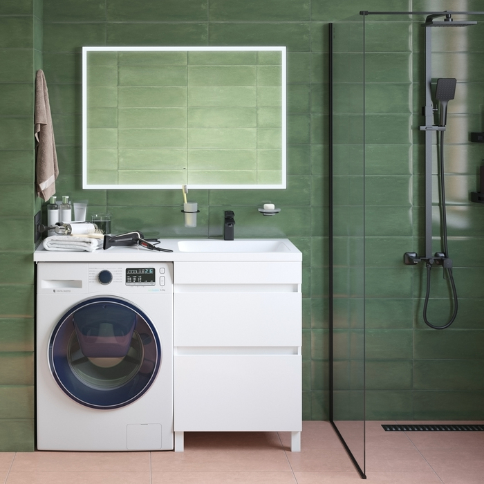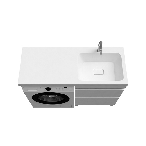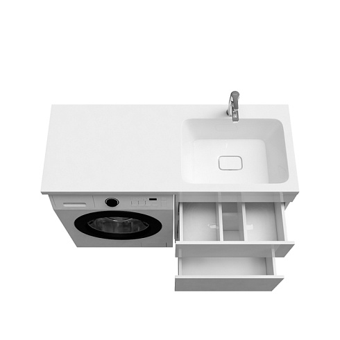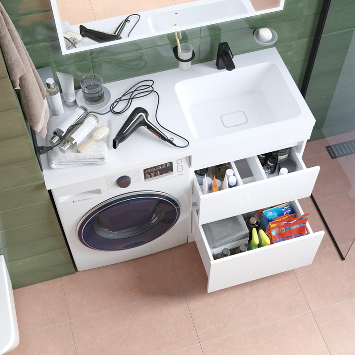 Тумба Optima Home – это удобное решение, чтобы организовать одновременно и зону умывания, и расположить стиральную машину. Модель подходит для установки стиральных машин с фронтальной загрузкой, слева от тумбы. В коллекции Optima Home также представлен вариант c расположением машинки справа от тумбы (арт. OPH12LBi95K). Два вместительных ящика обеспечивают удобное хранение ванных принадлежностей и аксессуаров, бытовой химии и принадлежностей для стирки. Высокие ножки позволяют скрыть коммуникации под тумбой и защитить ее от повреждения при затоплении. Тумбу дополняет умывальник (арт. 480120Ri28) с длинным крылом и большой, глубокой чашей.