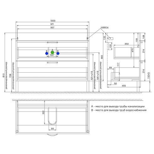 • Два просторных выдвижных ящика закрываются плавно и бесшумно благодаря скрытым направляющим с доводчиками немецкого производства. Ограничитель под сифон в верхнем ящике позволяет эффективнее использовать его пространство.