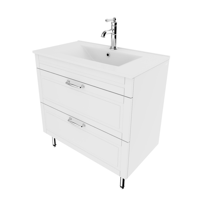 Напольная тумба из коллекции Oxford – модное сочетание классического стиля со стилем ретро. Поверхность корпуса изделия обладает приятным, оригинальным свойством – на ощупь она бархатистая. Подобный эффект обеспечивает специальная полуматовая полимерная эмаль с эффектом soft touch. Коллекция органично впишется в любой интерьер благодаря сбалансированному дизайну и элегантному фрезерованному фасаду. Полированные ножки и ручки тумбы не только гармонично дополняют белый полуматовый фасад, но и поддерживают дизайн смесителей IDDIS® коллекции Oxford. Что позволит оформить пространство ванной в едином стиле без дополнительных временных затрат. Плоский эргономичный умывальник идет в комплекте.