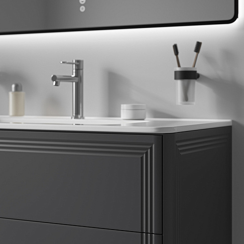 Материал фасадов и боковин – МДФ с покрытием тёмно-серой матовой эмалью (RAL7015). Продумано для использования в помещениях с высокой влажностью и сохранит первоначальный вид мебели надолго (при должном уходе).