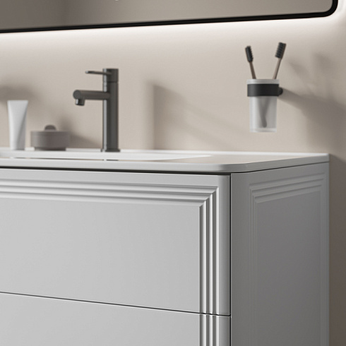 Вместительная подвесная тумба Oxford Neo с умывальником и выдвижными ящиками в элегантном стиле нео-классика с изящной фрезеровкой на фасадах и торцах. Идеально дополнит современные и классические интерьеры и станет настоящим украшением ванной. При желании тумбу можно сделать напольной – ножки высотой 30 см продаются отдельно в трёх цветах (белый, чёрный и светлый бук).