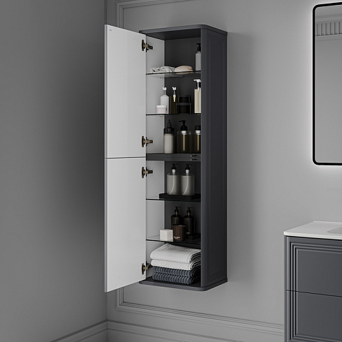 Подвесной пенал для ванной комнаты Oxford Neo в элегантном стиле нео-классика с изящной фрезеровкой на фасадах и торцах. Универсальная ориентация: пенал можно подвесить так, чтобы дверки открывались в удобную вам сторону (пенал можно перевернуть на 180 градусов, при этом перевешивать дверцы не нужно). При желании пенал можно сделать напольным – ножки высотой 30 см продаются отдельно в трёх цветах (белый, чёрный и светлый бук).