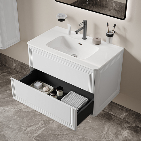 Вместительная подвесная тумба Oxford Neo с умывальником и выдвижными ящиками в элегантном стиле нео-классика с изящной фрезеровкой на фасадах и торцах. Идеально дополнит современные и классические интерьеры и станет настоящим украшением ванной. При желании тумбу можно сделать напольной – ножки высотой 30 см продаются отдельно в трёх цветах (белый, чёрный и светлый бук).