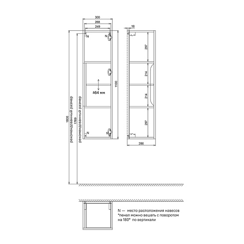 Четыре регулируемых навеса рассчитаны на большой вес до 50 кг и позволяют установить пенал с открытием дверок в левую или правую сторону.