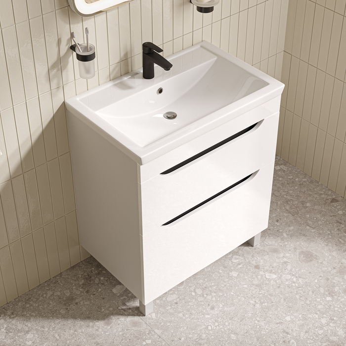 Напольная тумба для ванной Ray с умывальником и выдвижными ящиками – универсальная и практичная мебель, которая будет отлично смотреться в любом современном интерьере. Сочетание белого цвета, светло-серых элементов фасада и тёмно-серых ящиков создаёт стильный дизайн вне времени. У тумбы увеличенная высота, что делает её более вместительной и удобной.