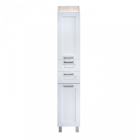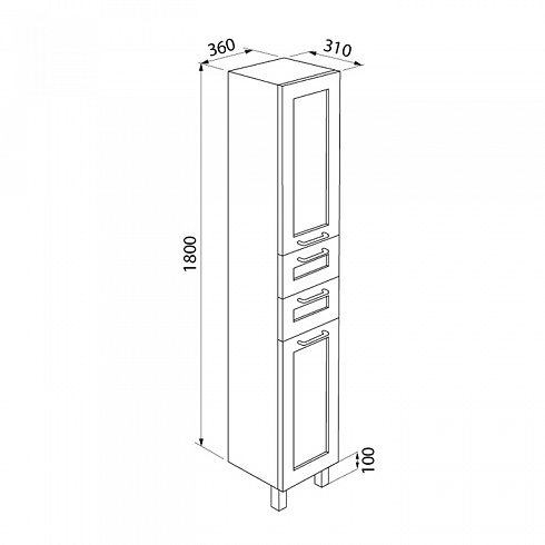Пенал для ванной комнаты, напольный. Размеры: 310х360х1800 мм (ДхШхВ). Фасад МДФ 19 мм в эмали (цвет белый глянец), фрезеровка. Корпус ВЛДСП 16 мм под дерево.Петли с доводчиками. Дверцы с хромированными ручками. Ящики без доводчиков. Стеклянные полки 4 мм с фиксаторами. Съемная корзина для белья. Упаковка: картон, пленка, пенопластовые уголки.