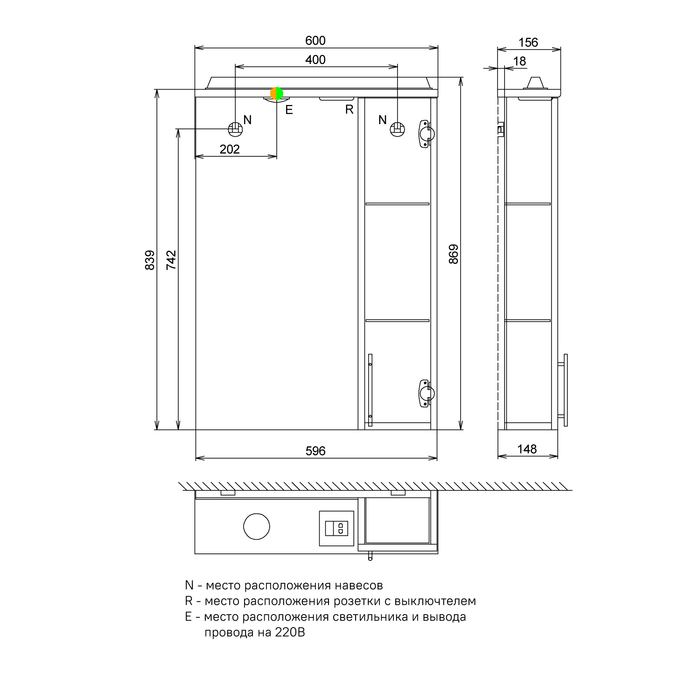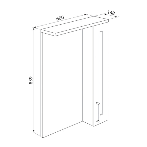 Шкаф-зеркало для ванной. Материал: ДСП. Размеры: 148х600х839 мм (ДхШхВ). Одна распашная дверца. Встроенная подсветка. Упаковка: картон, пленка, пенопластовые уголки.