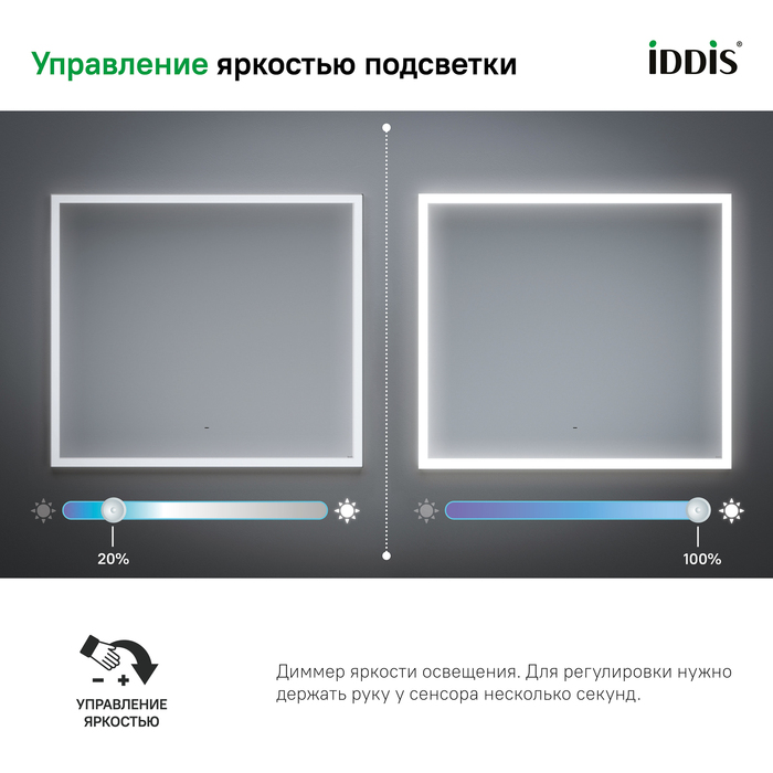 • Для управления подсветкой достаточно простого взмаха руки перед овальным сенсором в нижней части зеркала IDDIS®. На зеркальной поверхности не остается отпечатков пальцев благодаря отсутствию контакта с руками.