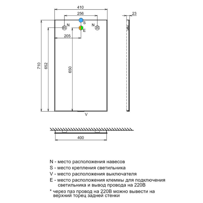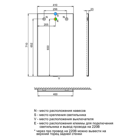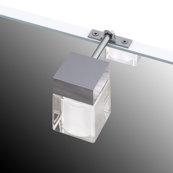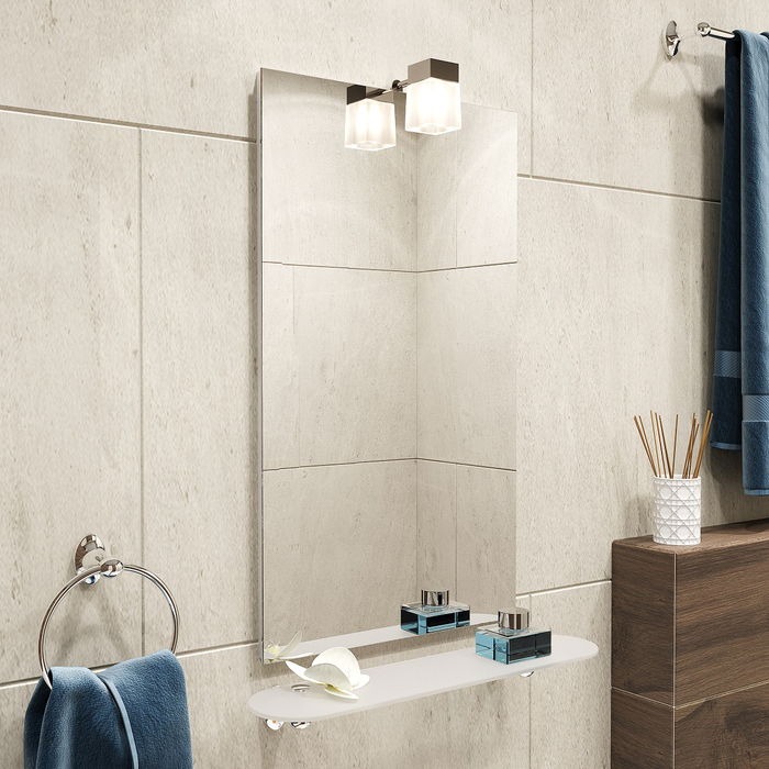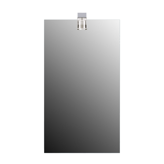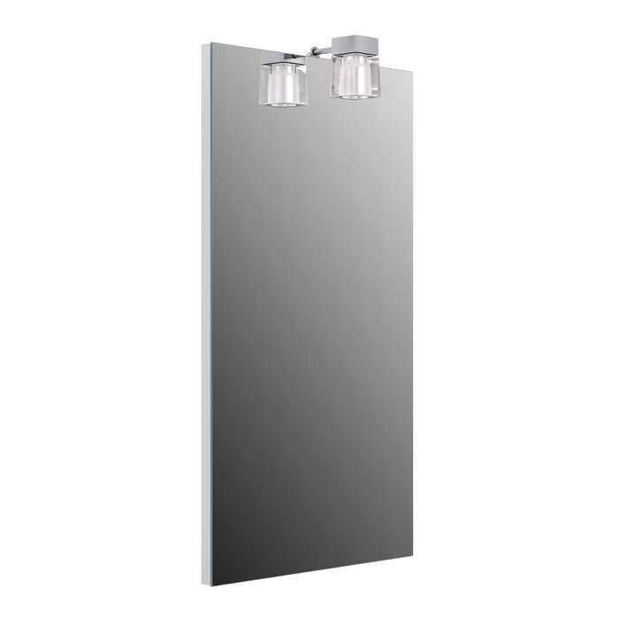 Зеркало для ванной. Размеры: 23х410х710 мм (ДхШхВ). Подложка ЛДСП 16 мм, зеркальное полотно 4 мм. Выносной галогеновый светильник 40 Вт, розетка, выключатель. Упаковка: картон, пленка, пенопластовые уголки.