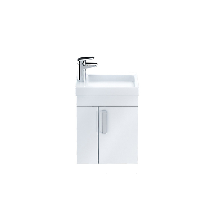 Тумба с умывальником для ванной комнаты, подвесная. Размеры тумбы без умывальника: 213х390х600 мм (ДхШхВ). Размеры умывальника: 220х400 мм (ДхШ). Фасад ЛДСП 16 мм в эмали, боковины ЛДСП белый глянец. Одна распашная дверца, 2 открытые полки. Сбоку тумбы - отверстие для гигиенического душа с пластиковым кольцом. Петли с доводчиком. Материал умывальника: фаянс, ширина: 40 см. Упаковка: картонная коробка.