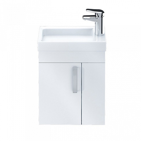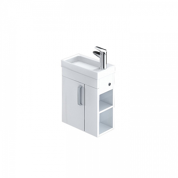 Тумба с умывальником для ванной комнаты, подвесная. Размеры тумбы без умывальника: 213х390х600 мм (ДхШхВ). Размеры умывальника: 220х400 мм (ДхШ). Фасад ЛДСП 16 мм в эмали, боковины ЛДСП белый глянец. Одна распашная дверца, фальш-фасад, 2 открытые полки с правой стороны. Сбоку тумбы - отверстие для гигиенического душа с пластиковым кольцом. Петли с доводчиком. Упаковка: картон, пленка, пенопластовые уголки.