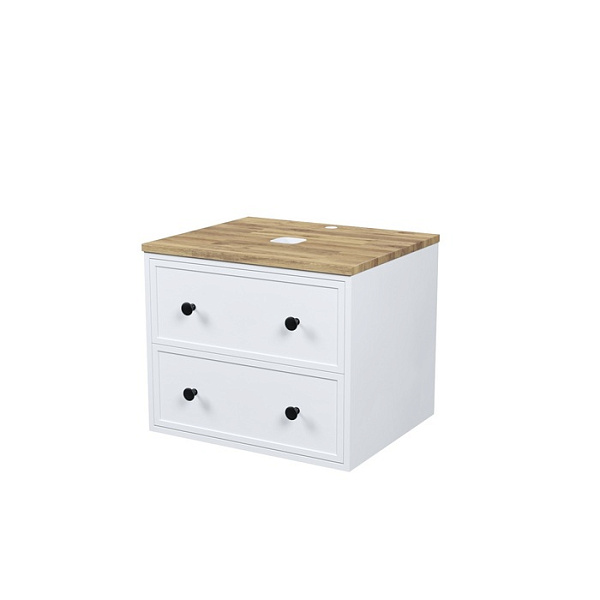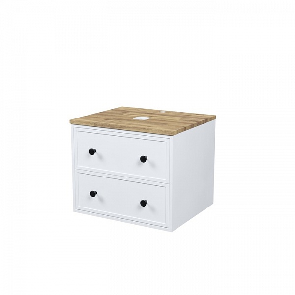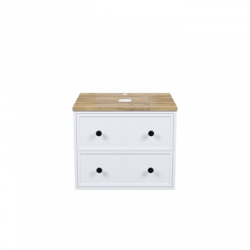 Компактная подвесная тумба Torr классического молочно-белого цвета со столешницей из клееного натурального дуба. Сочетает в себе узнаваемый стиль и практичность популярного скандинавского дизайна. Ее четкие формы, теплый цвет дерева, фасады с декоративной филенкой, круглые ручки смотрятся гармонично и впишутся в любой современный интерьер. Подойдет любой накладной умывальник, покупается отдельно.