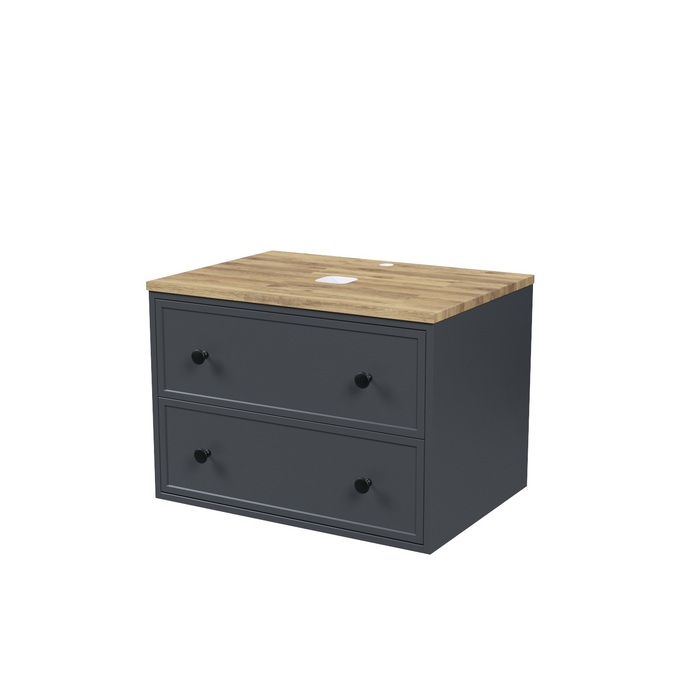 Компактная подвесная тумба Torr трендового темно-серого цвета со столешницей из клееного натурального дуба. Сочетает в себе узнаваемый стиль и практичность популярного скандинавского дизайна. Ее четкие формы, теплый цвет дерева, фасады с декоративной филенкой, круглые ручки смотрятся гармонично и впишутся в любой современный интерьер. Подойдет любой накладной умывальник, покупается отдельно.