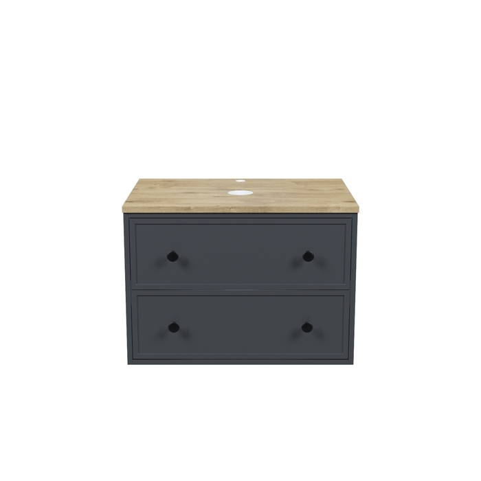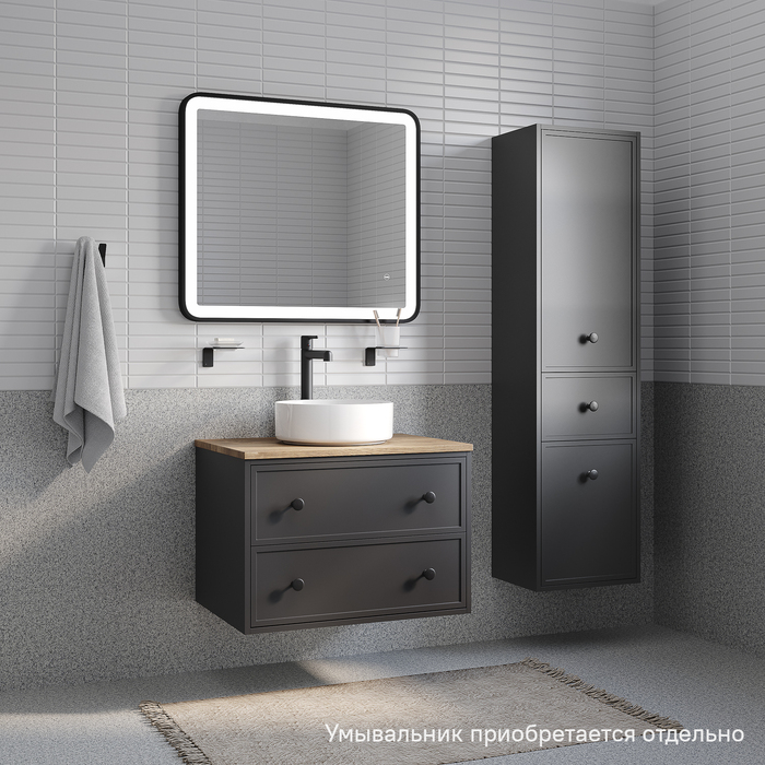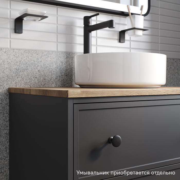 Компактная подвесная тумба Torr трендового темно-серого цвета со столешницей из МДФ в оттенке дуба верона. Сочетает в себе узнаваемый стиль и практичность популярного скандинавского дизайна. Ее четкие формы, теплый цвет дерева, фасады с декоративной филенкой, круглые ручки смотрятся гармонично и впишутся в любой современный интерьер. Подойдет любой накладной умывальник, покупается отдельно.