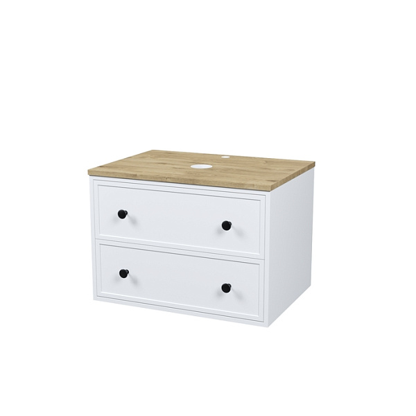 Компактная подвесная тумба Torr классического молочно-белого цвета со столешницей из МДФ в оттенке дуба верона. Сочетает в себе узнаваемый стиль и практичность популярного скандинавского дизайна. Ее четкие формы, теплый цвет дерева, фасады с декоративной филенкой, круглые ручки смотрятся гармонично и впишутся в любой современный интерьер. Подойдет любой накладной умывальник, покупается отдельно.