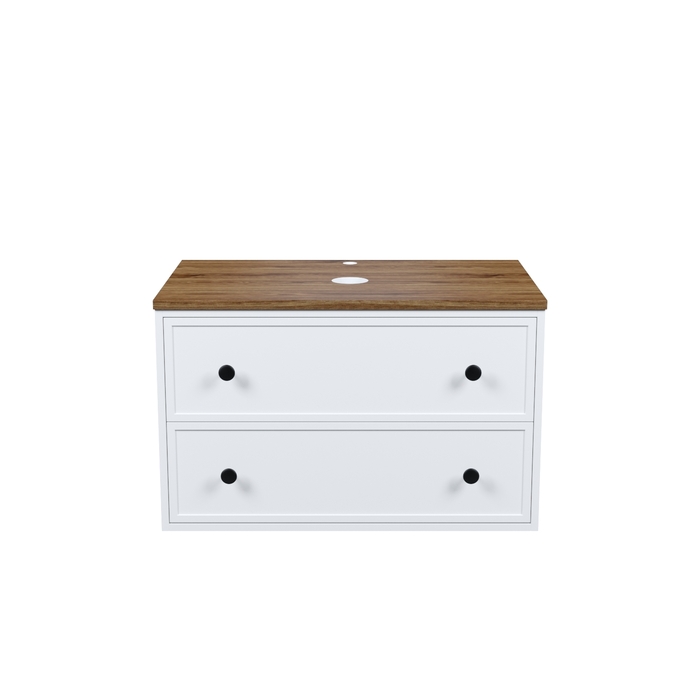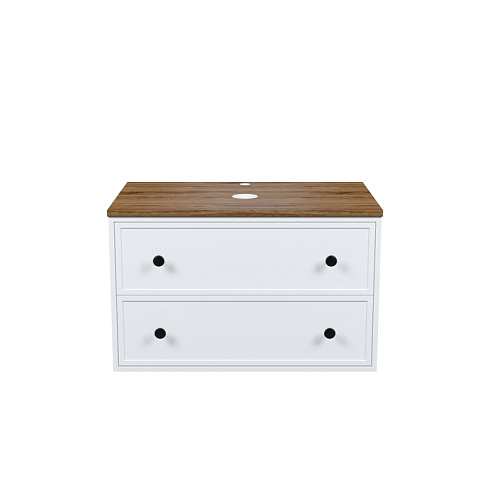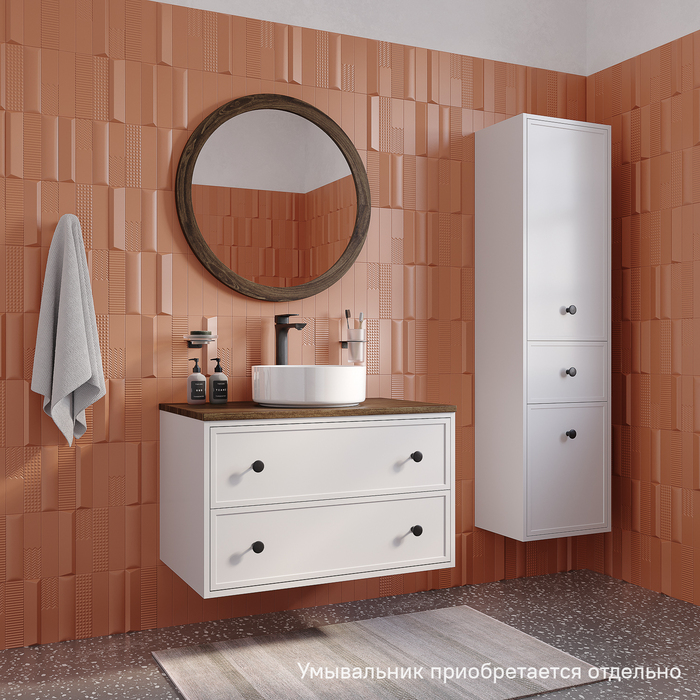 Вместительная подвесная тумба Torr классического молочно-белого цвета со столешницей из МДФ в оттенке ореха макадамия. Сочетает в себе узнаваемый стиль и практичность популярного скандинавского дизайна. Ее четкие формы, теплый цвет столешницы, фасады с декоративной филенкой, круглые ручки смотрятся гармонично и впишутся в любой современный интерьер. Подойдет любой накладной умывальник, покупается отдельно.