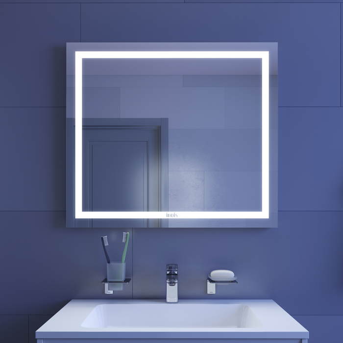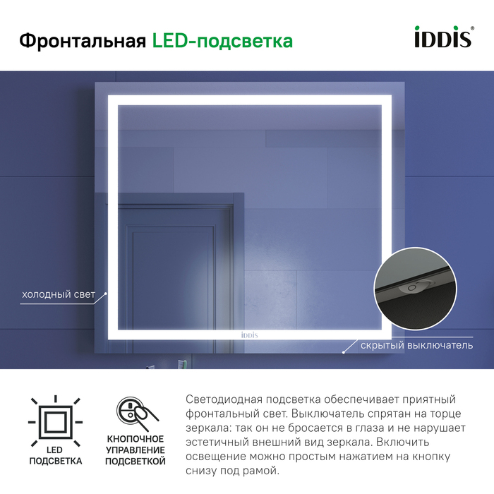 • На зеркальной поверхности не остается отпечатков пальцев благодаря механическому управлению светодиодной подсветкой. Выключатель спрятан на торце зеркала и невидим взгляду – активировать освещение можно простым нажатием на кнопку.