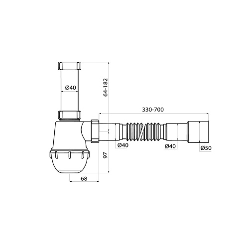 • Гофротруба длиной от 330 до 700 мм позволяет установить сифон без точной подгонки под канализационный вывод.